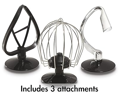 - The attachments that come with this model include whisk, dough hook, and non-stick flat beater. These attachments allow you to cream, whip, mix, beat and blend ingredients.